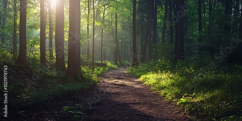 Fototapeta premium Sunbeams through forest trees on a path