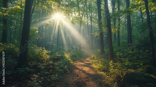 © BOJOShop, Obraz premium Sunbeams through Forest Trees on Path
