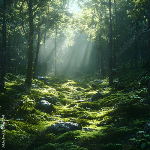 © studio, Fototapeta premium Sunbeams Through Forest Trees - Realistic 3D Illustration