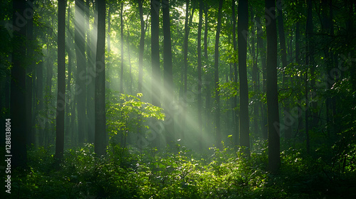 © Robin, Fototapeta premium Sunbeams Through Lush Green Forest