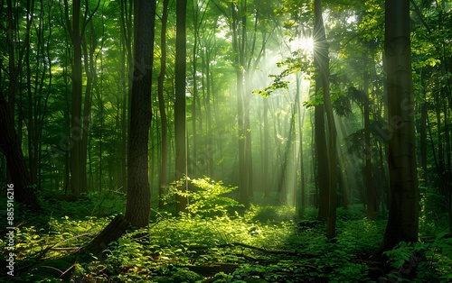 Obraz premium Sunbeams Through Lush Green Forest