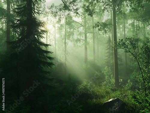 © projek, Naklejka premium Sunbeams through Misty Forest