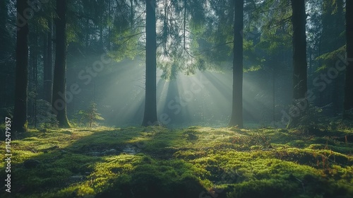 © MINHO, Obraz premium Sunbeams Through Misty Forest: A Serene Woodland Landscape