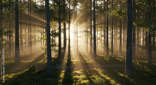 Obraz premium Sunbeams through Misty Forest at Sunrise