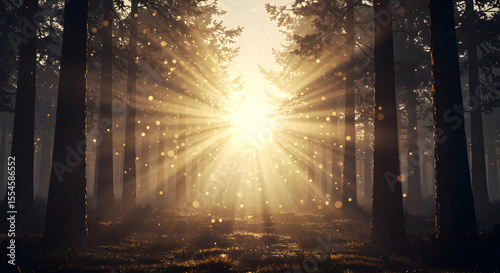 Obraz premium Sunbeams through misty forest magical nature scene peaceful tranquility...