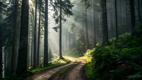 Obraz premium Sunbeams through misty forest path