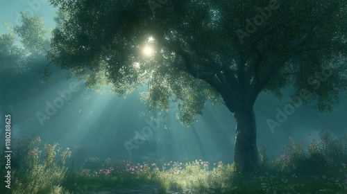 © TOWEL, Obraz premium Sunbeams through misty forest trees at dawn.