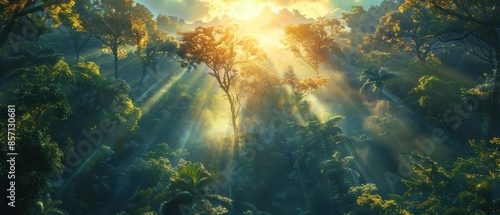 Obraz premium Sunbeams Through Rainforest Canopy.