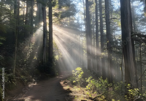 Obraz premium Sunbeams Through Redwood Forest Trail
