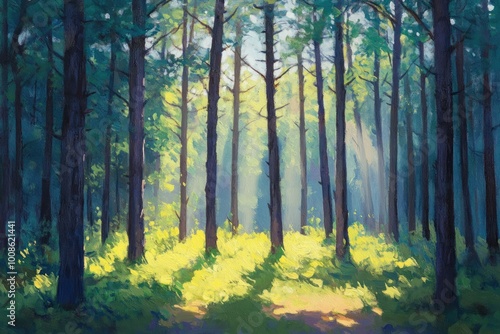 © MrHamster, Fototapeta premium Sunbeams Through Tall Trees in a Dense Forest