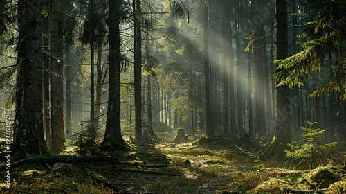 Fototapeta premium Sunbeams Through Tall Trees in a Misty Forest