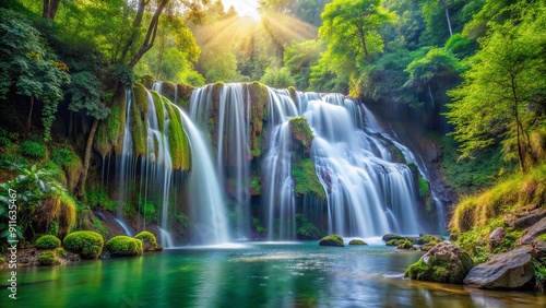 © BondGraphics, Fototapeta premium Sunbeams Through the Emerald Waterfall, Waterfall, Nature, Landscape, Forest ,