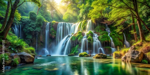 Obraz premium Sunbeams through the Forest Waterfall, Waterfall Photography, Forest...
