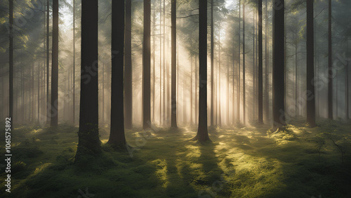 © P, Obraz premium Sunbeams Through the Mist: A mystical and captivating scene of sunlight piercing through the dense foliage of a forest, illuminating the moss-covered ground with ethereal glow.