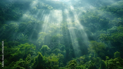 Obraz premium Sunbeams Through the Mist: A Tropical Forest Awakens