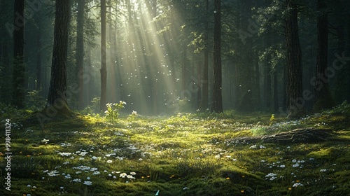 © Wish Craft Arts, Obraz premium Sunbeams through the trees, illuminating a forest floor covered in white flowers.