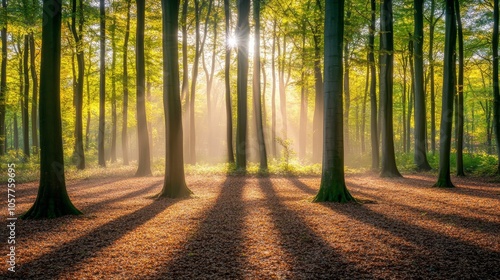 © BrilliantPixels, Fototapeta premium Sunbeams Through the Trees in an Autumn Forest