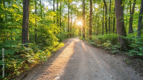 © Mahavira Osa, Fototapeta premium Sunbeams Through the Trees on a Forest Path