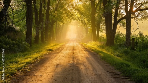 © Mahavira Osa, Obraz premium Sunbeams through the Trees on a Misty Morning
