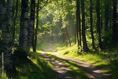 Obraz premium Sunbeams through trees in forest, path leading into woods, green foliage,...