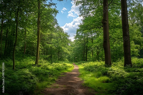 © atar, Fototapeta premium Sunbeams Through Trees in Lush Forest with Path, Nature Background