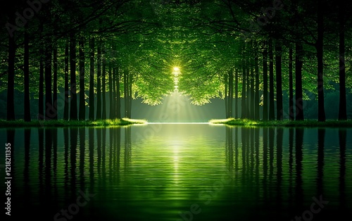 © ABIDZAR ALFAREZ, Obraz premium Sunbeams through trees reflected in calm water.