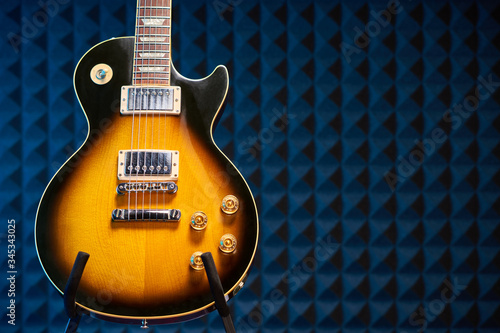 Fototapeta premium Sunburst electric guitar standing over acoustic foam panel background