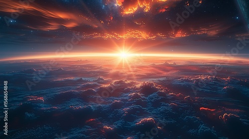© Ramlan, Fototapeta premium Sunburst glows above clouds, horizon glowing. Crimson and blue hues with celestial light beams and soft textures