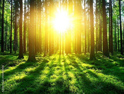 © Ata, Fototapeta premium Sunburst in Lush Green Forest.