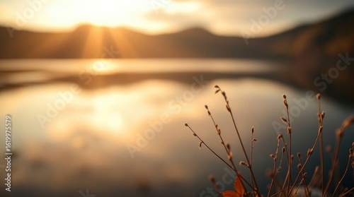 © Novi, Fototapeta premium Sunburst on water backdrop dried grass foreground