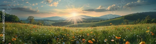 © ngstock, Fototapeta premium Sunburst over a picturesque countryside with rolling hills and wildflowers