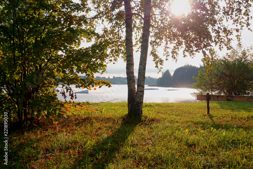 © NetPix, Fototapeta premium Sunburst through a tree near a tranquil lake