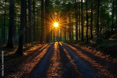 Fototapeta premium Sunburst Through Forest Canopy Illuminating Dirt Road With Striking Shadows...