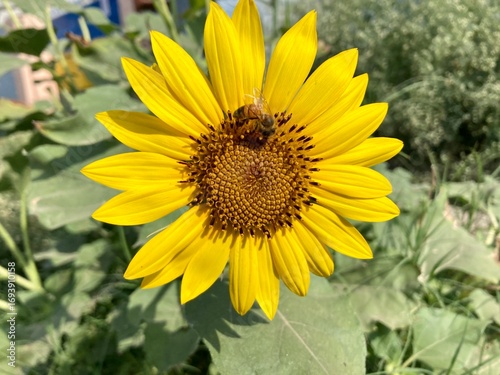 Naklejka premium sunflower and bee, A busy bee collects pollen from a bright yellow sunflower blooming in a sunny summer garden