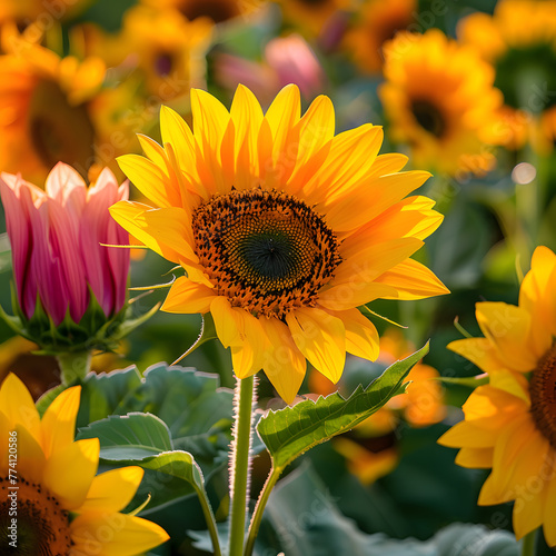 Naklejka premium sunflower and tulip with sunlight in the foreground