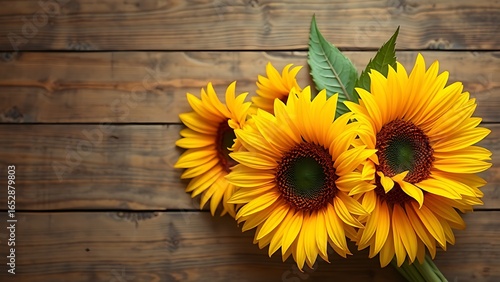© jow, Obraz premium Sunflower arrangement on a rustic wooden surface with warm yellow tones.