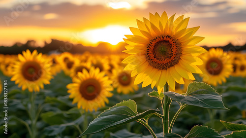 Fototapeta premium Sunflower field at sunset with bright flowers and sky in the background