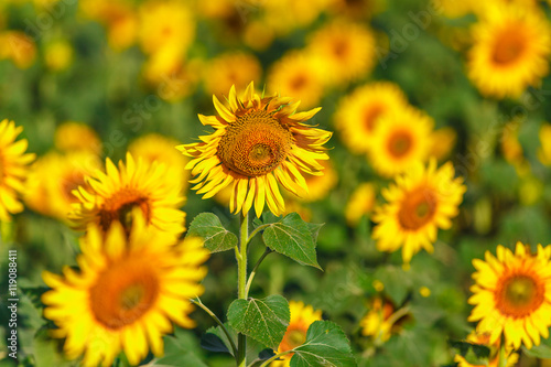 © Andrey Cherkasov, Obraz premium Sunflower field Background on sunset with selective focus