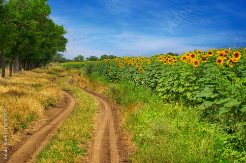 © tverkhovynets, Naklejka premium Sunflower field by the road