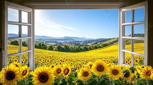 © projek, Obraz premium Sunflower field view from window