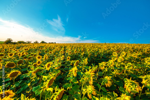 © dmytro_khlystun, Obraz premium Sunflower field with cloudy blue sky.