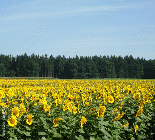 © Adrian Murphy, Fototapeta premium Sunflower field with forest in background
