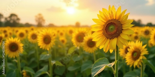 © Kanyapat, Obraz premium Sunflower fields with tall stalks swaying in breeze, sunflowers, summer