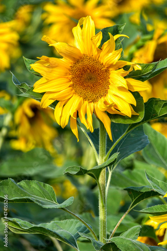 Fototapeta premium Sunflower flower closeup on a blurred background. Blooming plant