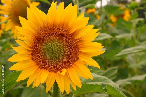 © Trik, Fototapeta premium Sunflower flower on a green field in backlight. Yellow Sunflower field.