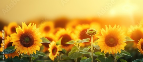 Fototapeta premium Sunflower flowers in a plantation. Creative banner. Copyspace image