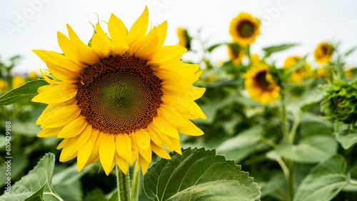 Fototapeta premium Sunflower growing in a field of sunflowers during a nice sunny summer day.