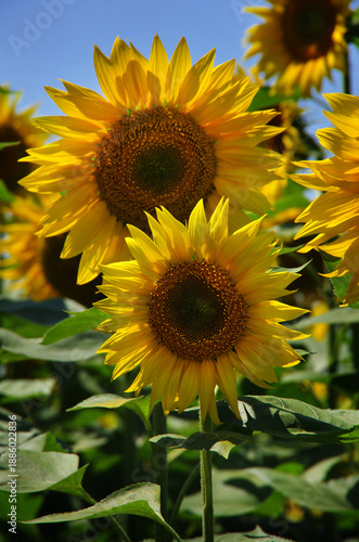© pavlobaliukh, Obraz premium Sunflower heads with yellow petals illuminated close-up