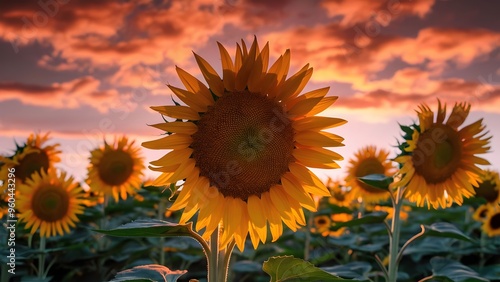© NovaNicheTee, Obraz premium Sunflower in field at sunset