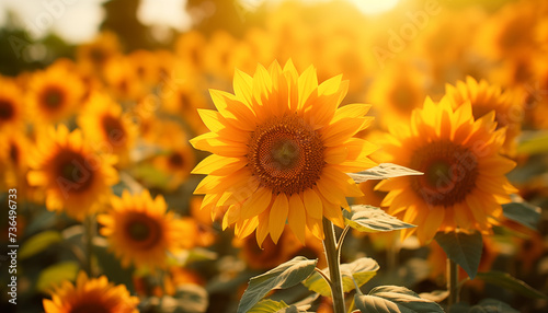 © Juli Puli, Fototapeta premium sunflower in sunlight against the background of a sunflower field. summer day background with ripe sunflower.